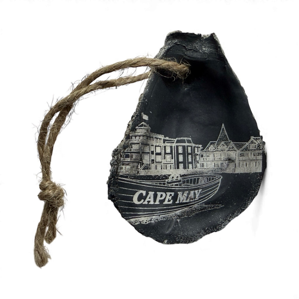 Bring a piece of Cape May into your home with this one-of-a-kind laser engraved oyster shell ornament. Each shell is naturally shaped by the sea and carefully engraved with Cape May’s iconic lifeguard rescue boat and beach scene. No two are exactly alike—your ornament will be as unique as the memories you made by the shore.