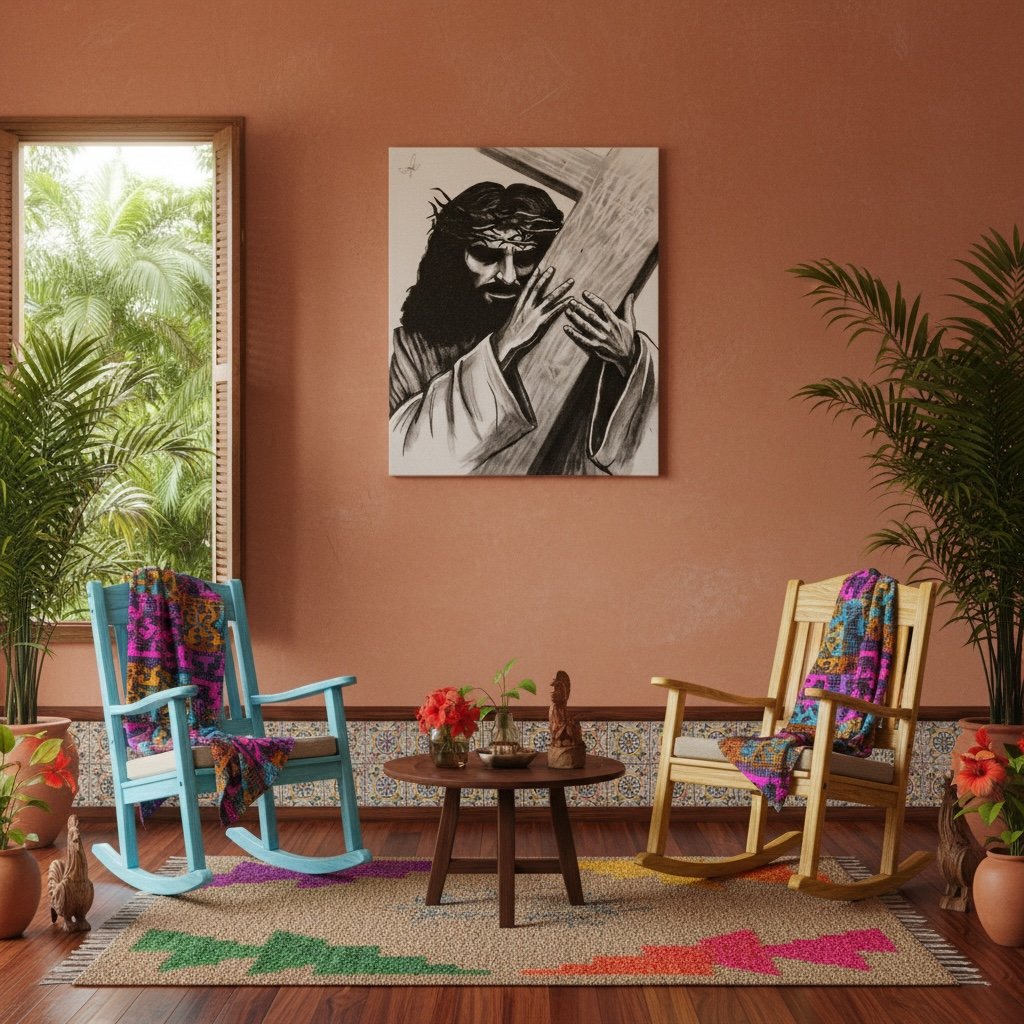 The Story Behind the Art This artwork was created by Bioff, a resident artist at the Helping Hands Orphanage in the Dominican Republic. His unique "Dominican Noir" style is a departure from traditional island art, offering a sophisticated and deeply spiritual perspective.