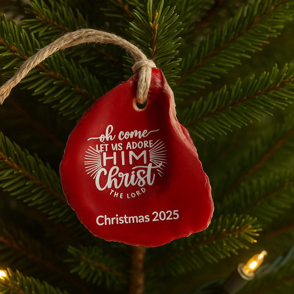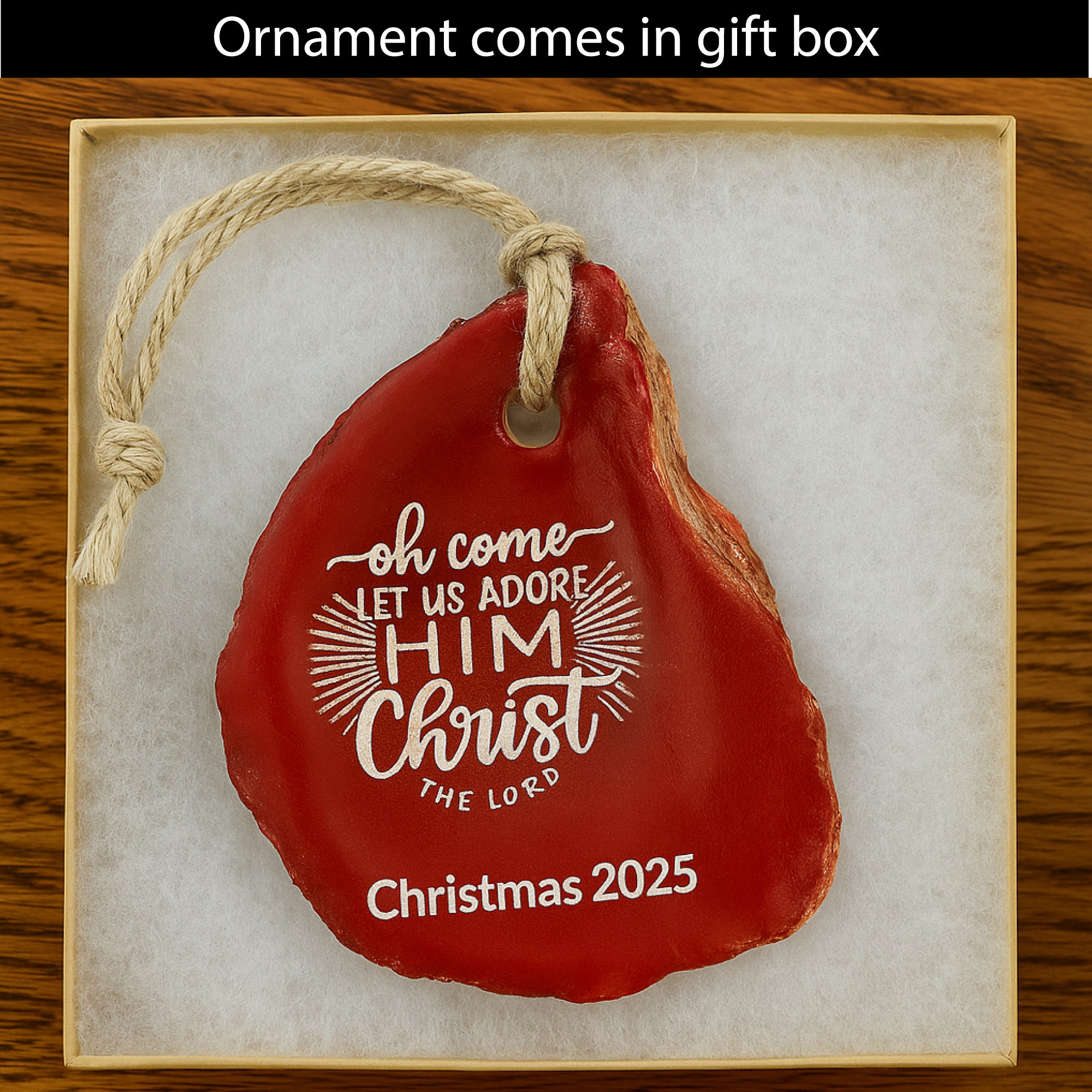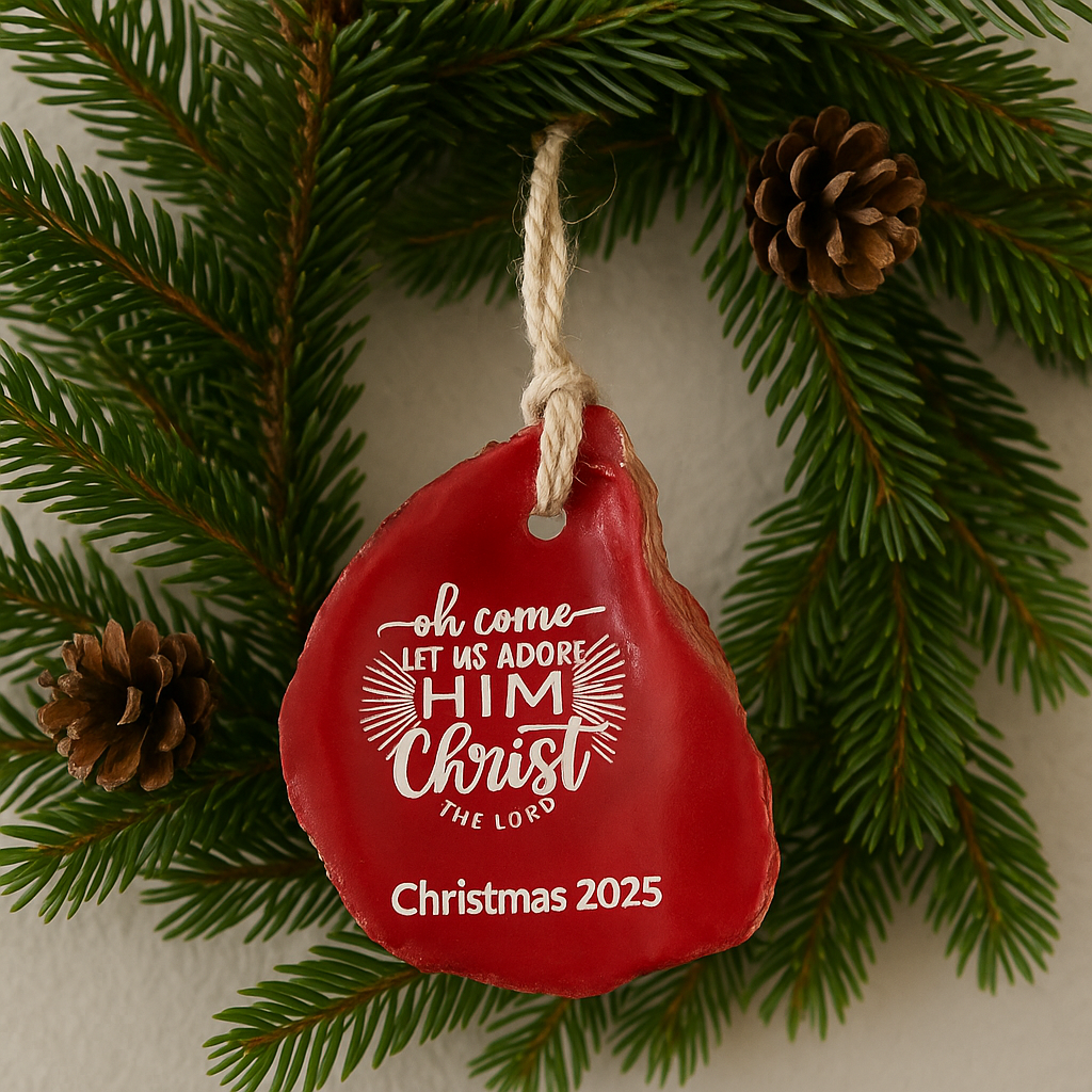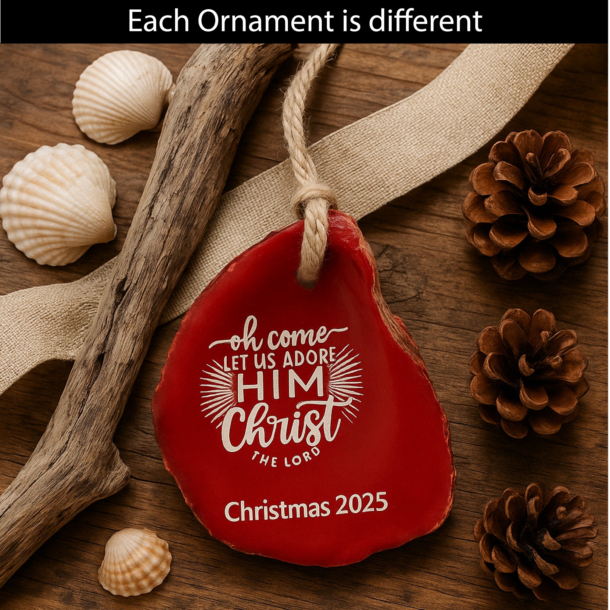 Laser Engraved Christmas Ornaments Made from Oyster Shells - Come Let us adore Him